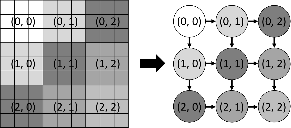 We partition the 9x9 grid into a 3x3 block and assign a task to one block. The wavefront propagates task dependencies from the top-left block all the way to the bottom-right block. Each task precedes two tasks, one to the right and another below.